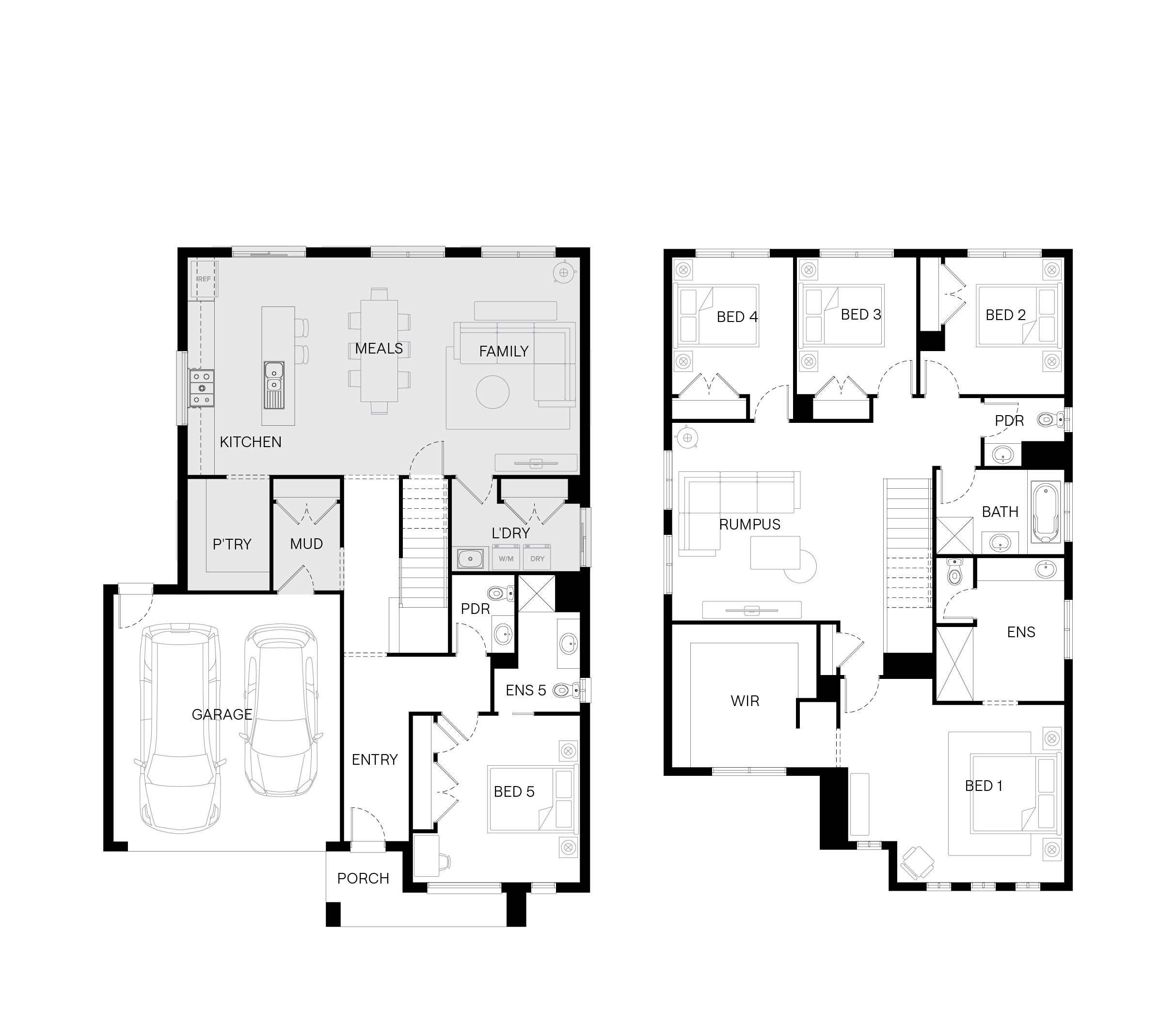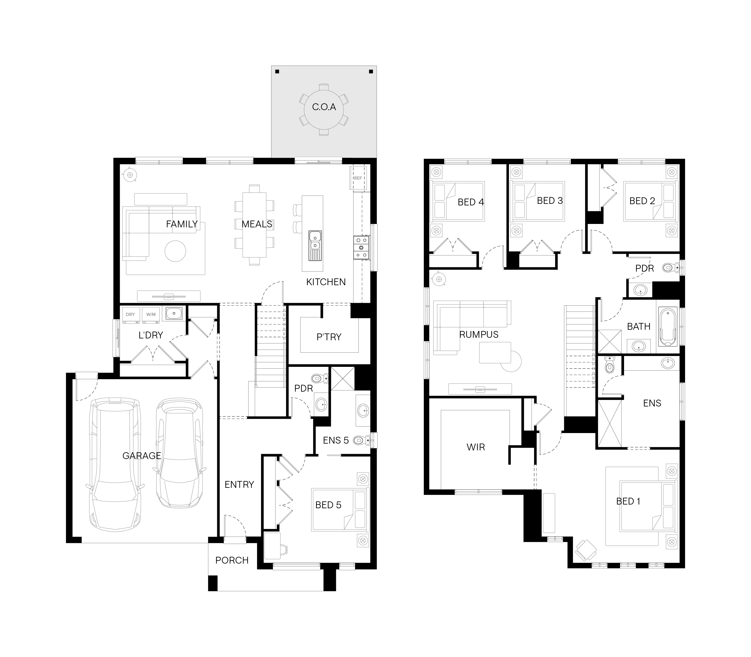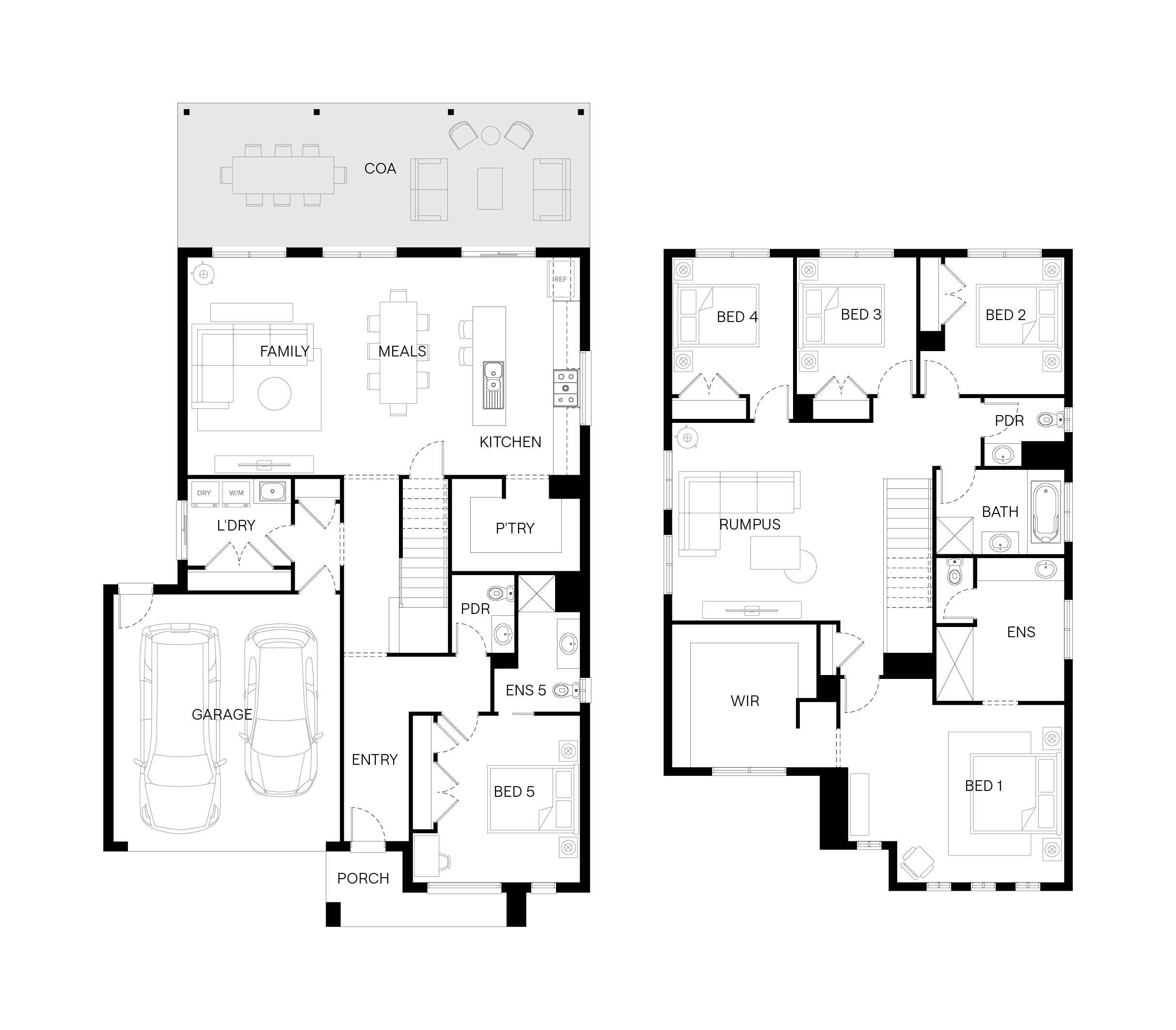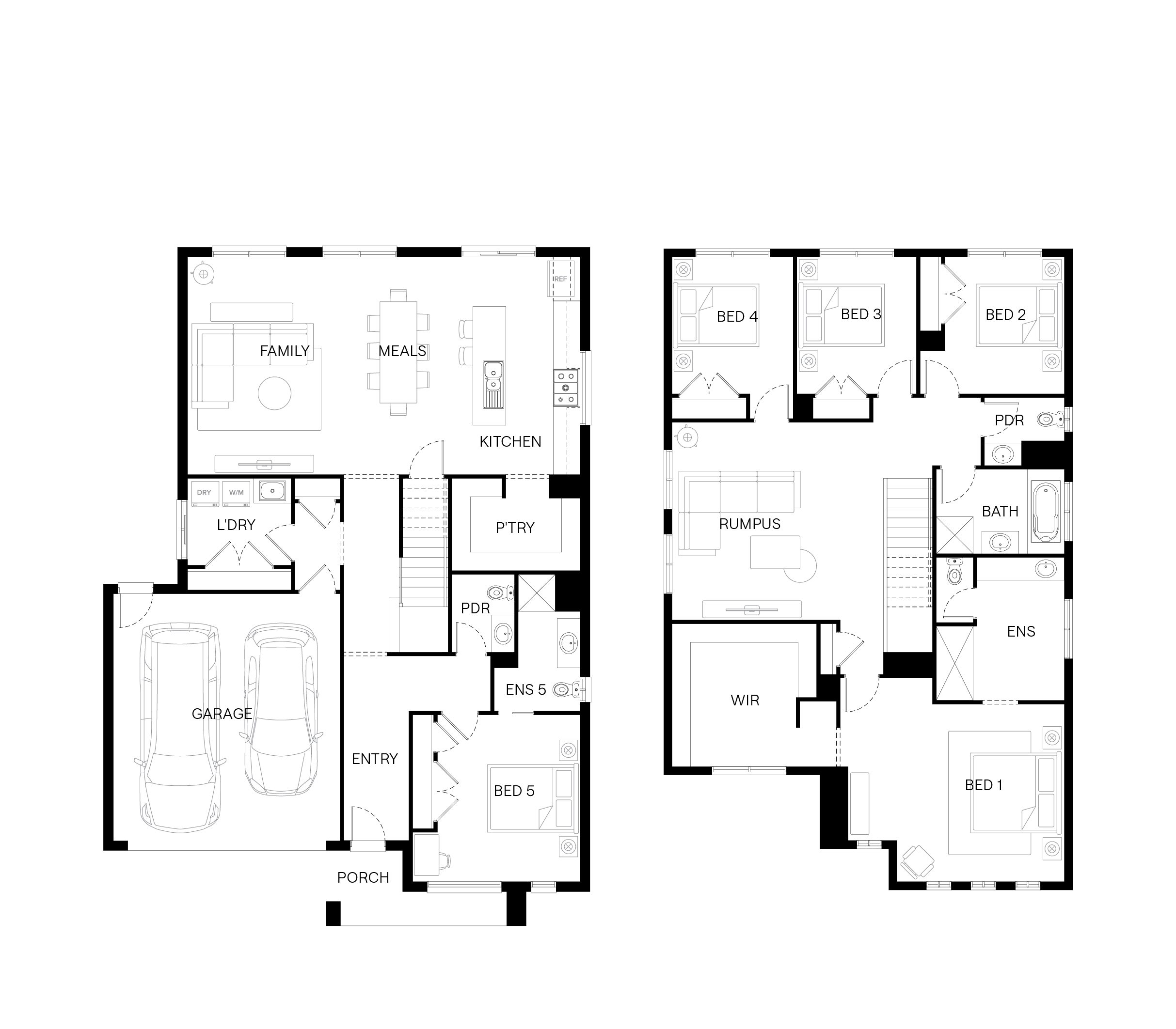 In the Avalon, five bedrooms and two living areas come together in a functional, double storey layout. The kitchen forms the heart of the home, and the upstairs rumpus offers a second space for relaxing or entertaining. It’s a design that keeps up with changing needs.