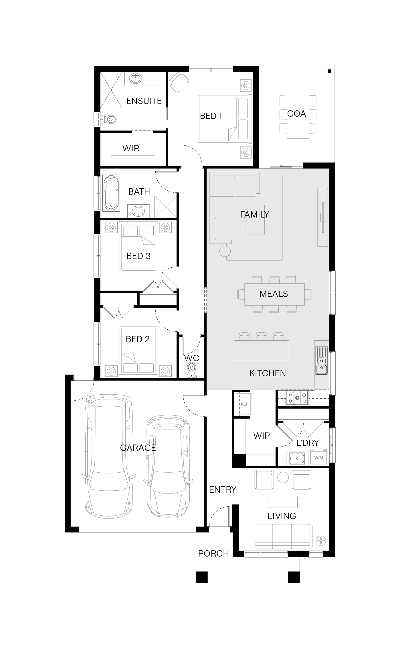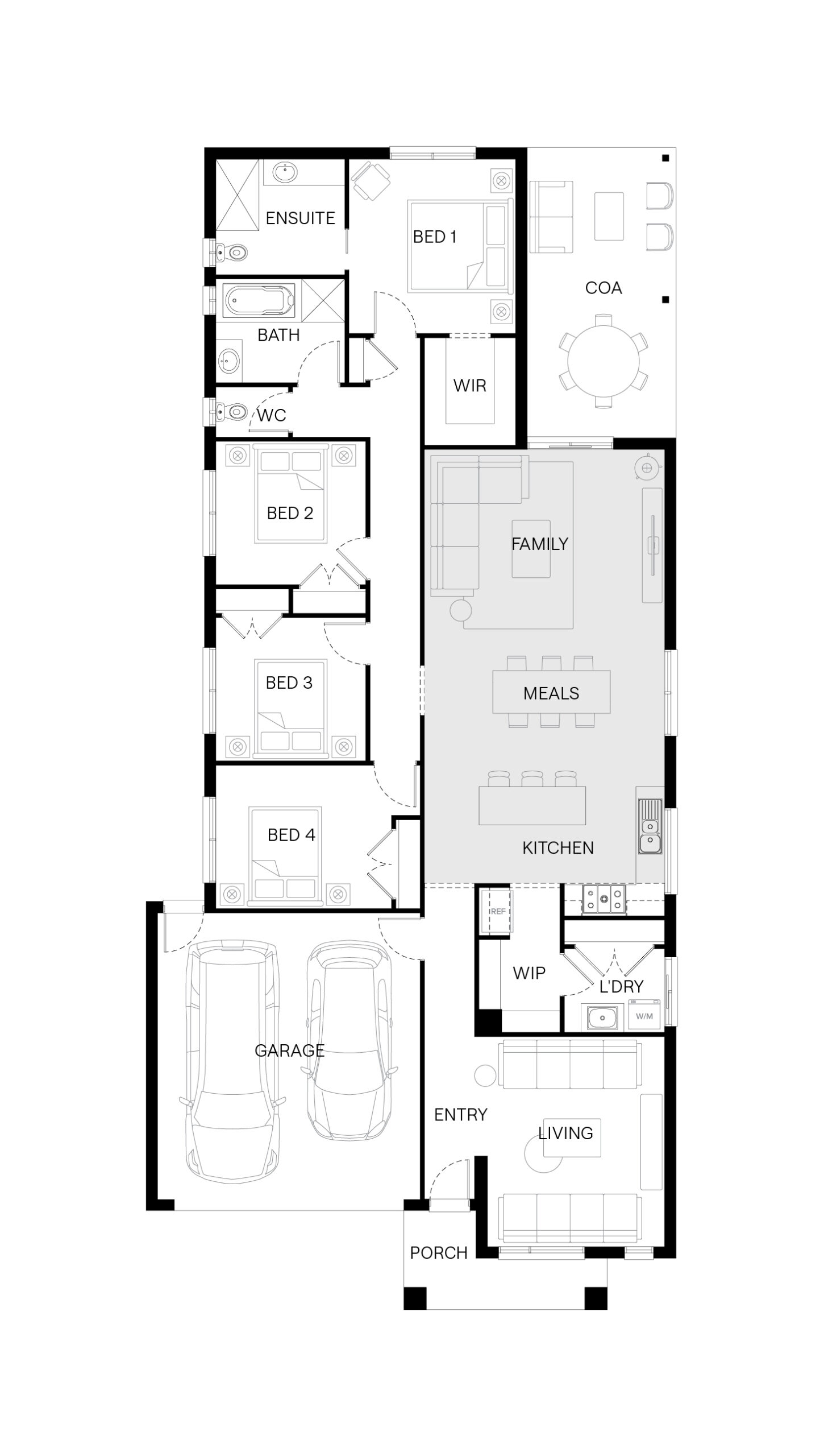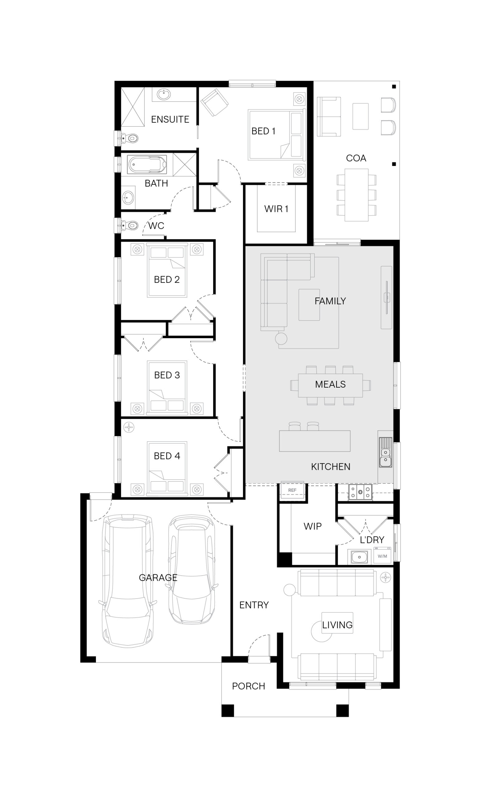 Step inside the Byron and you’ll find a home designed for both connection and retreat. A front living room adds flexibility for work or quiet moments, while the main bedroom at the rear offers a peaceful retreat. At the centre, the kitchen, meals and family area opens to a spacious outdoor living zone—creating the perfect setting for gatherings that flow easily inside and out.