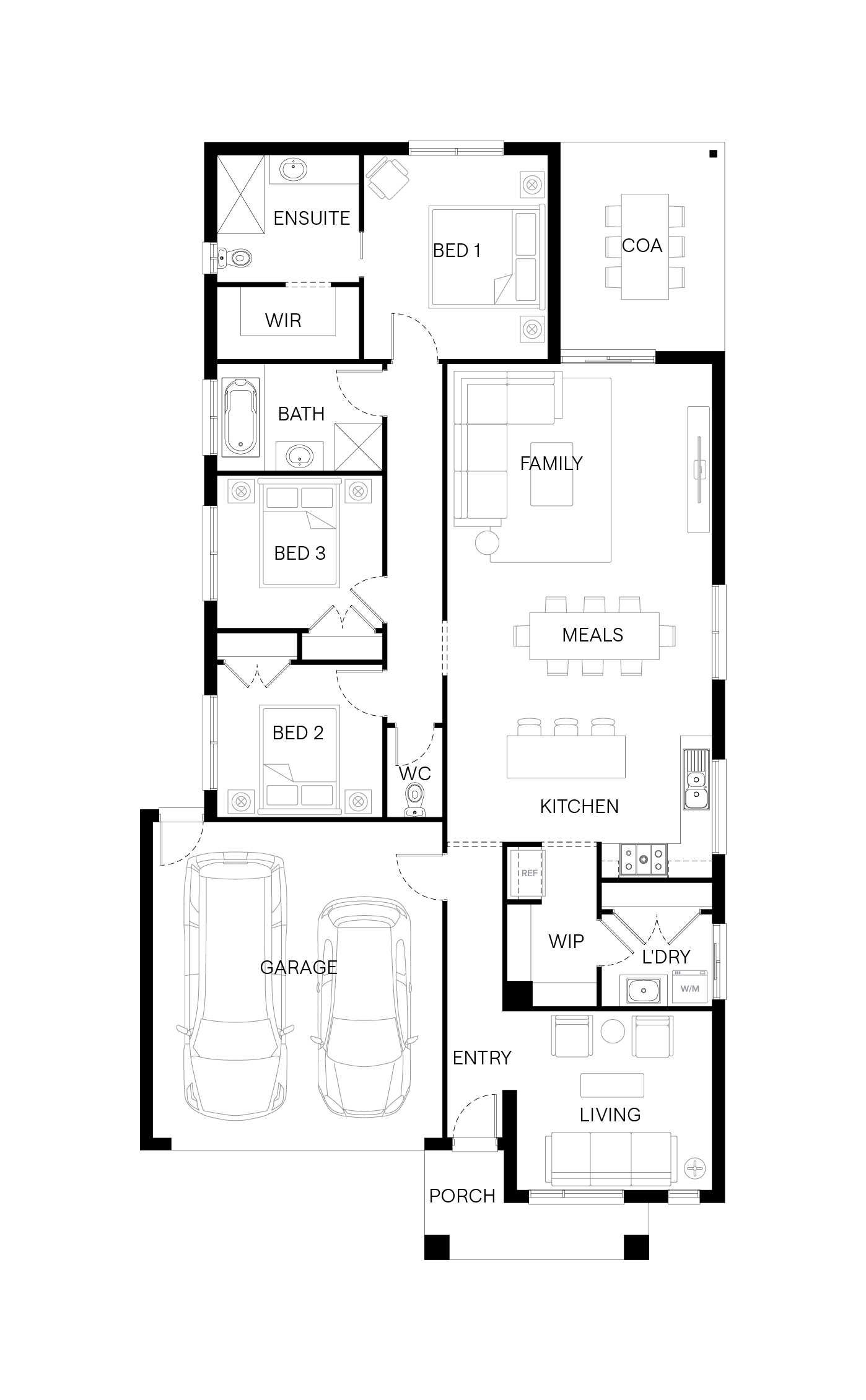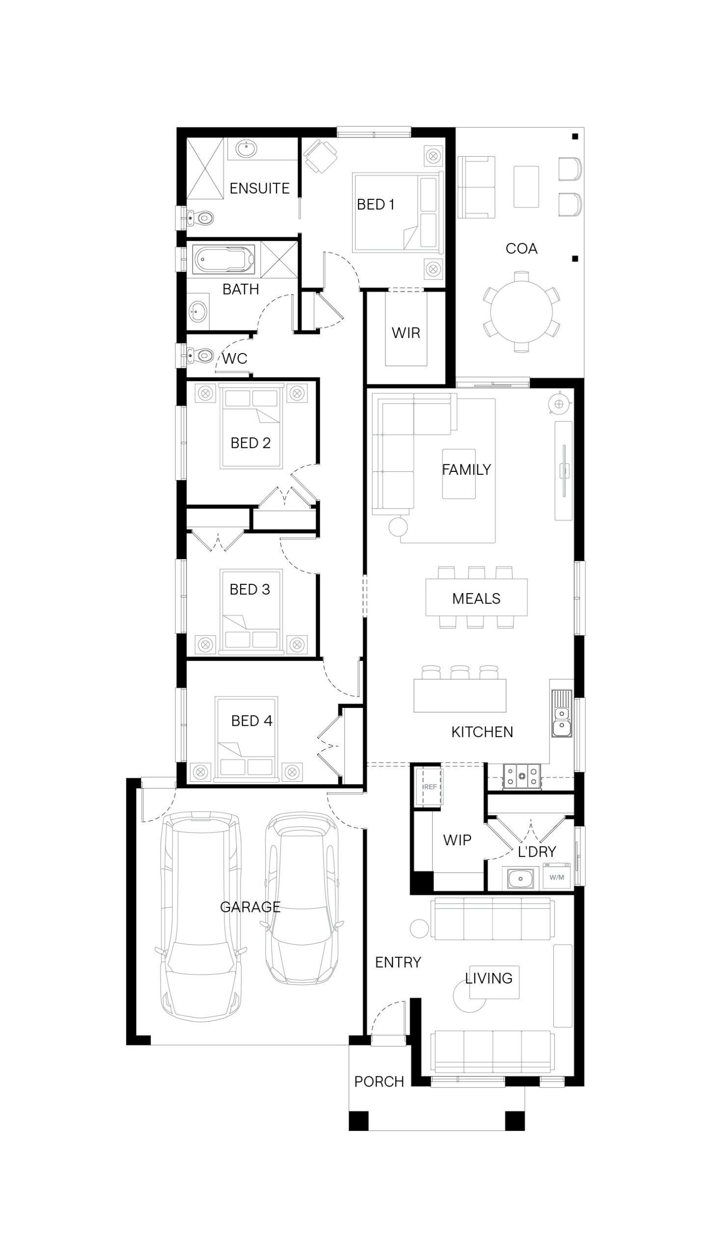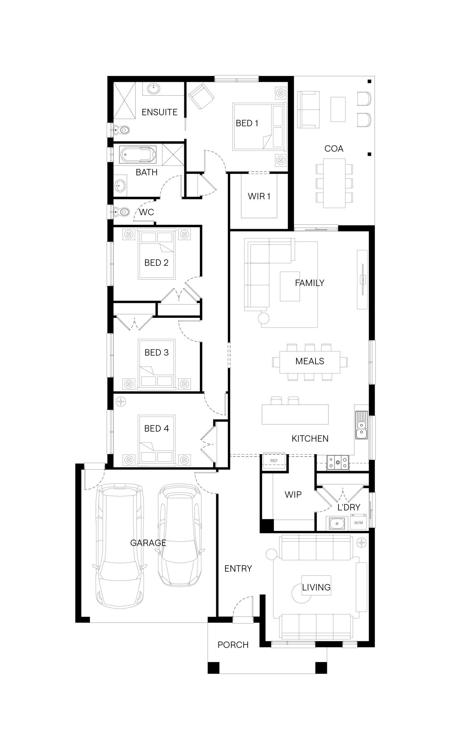 Step inside the Byron and you’ll find a home designed for both connection and retreat. A front living room adds flexibility for work or quiet moments, while the main bedroom at the rear offers a peaceful retreat. At the centre, the kitchen, meals and family area opens to a spacious outdoor living zone—creating the perfect setting for gatherings that flow easily inside and out.
