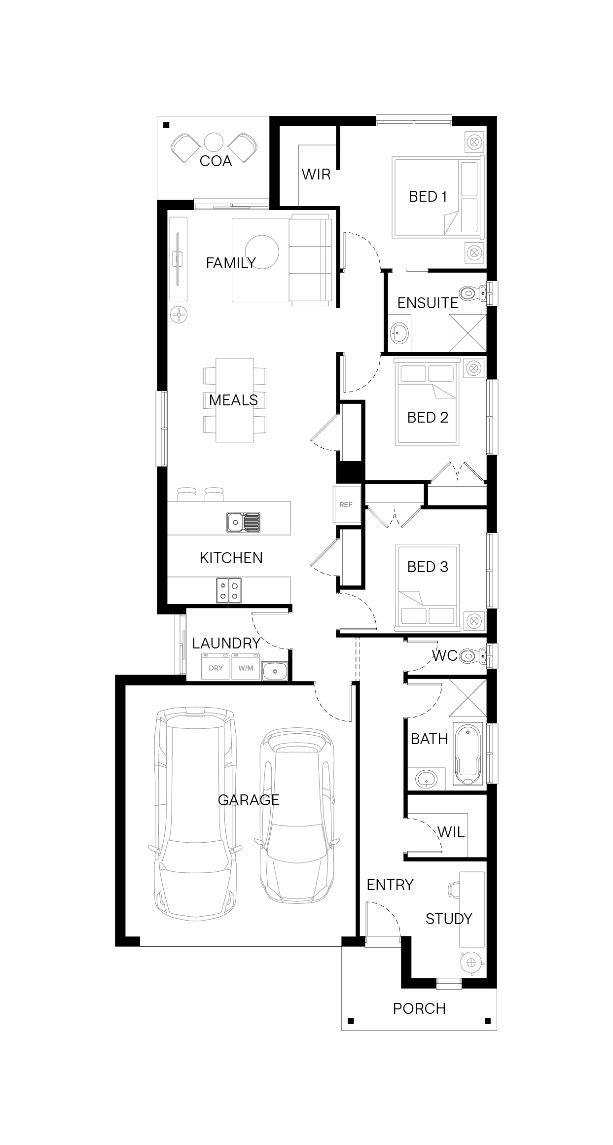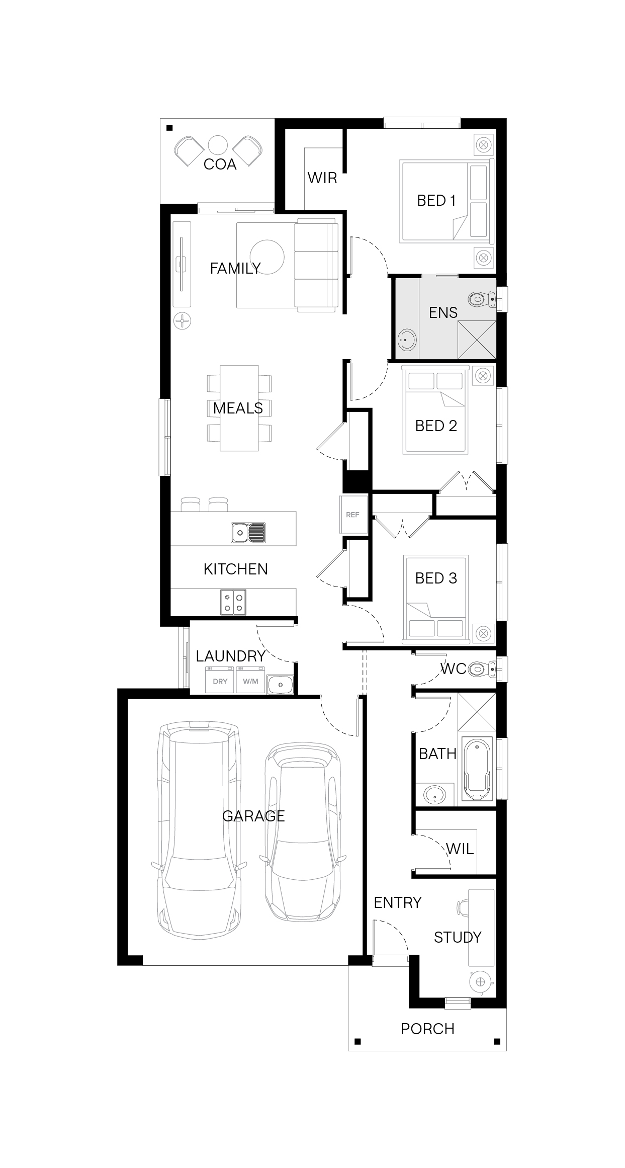 With its main bedroom tucked at the back and a study near the entry, the Elliot offers the kind of layout that supports both quiet and connection. The open-plan living and meals area flows to the kitchen and out to the backyard, giving you space to gather or pause. Every part of the home is shaped to make the day feel easier.
