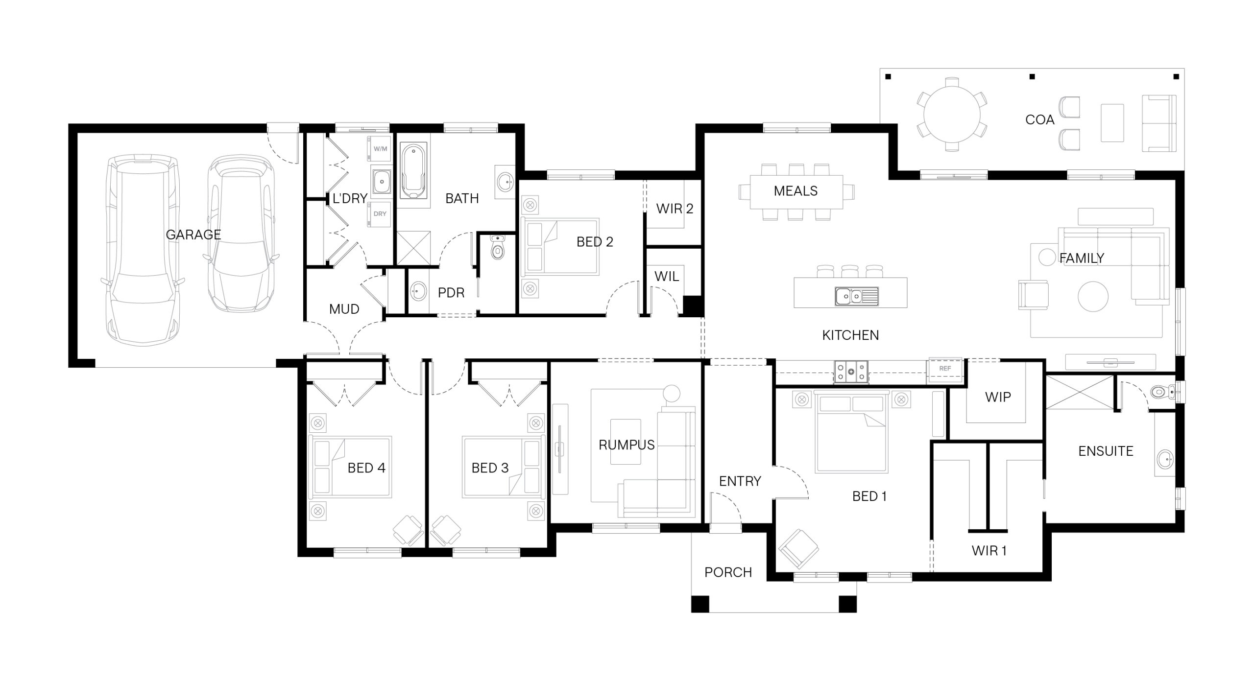 The Hawksbury takes its cues from classic ranch-style living, with a long, flowing design that separates rest from play. Blending practical function with a sense of retreat. Bedrooms form a private wing on one side, while the opposite wing holds the main bedroom, opening into generous living and entertaining spaces. It’s a home designed to feel expansive, balanced and full of life, with room for everything that makes a house feel like home.