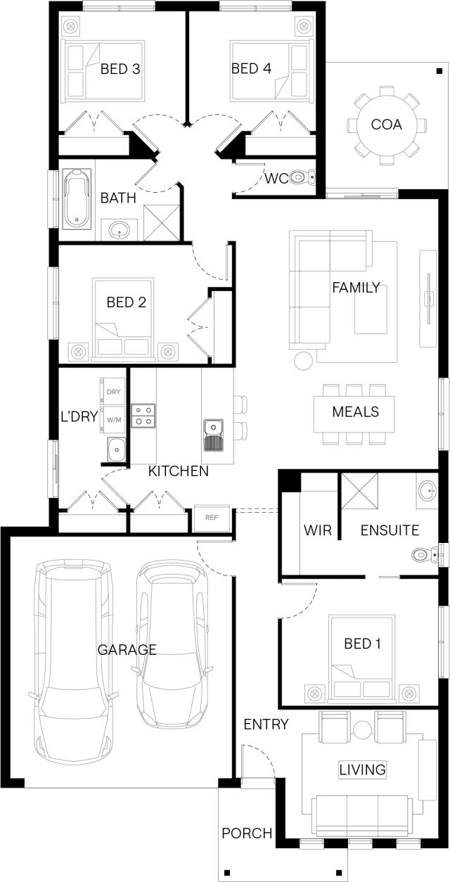 Embrace contemporary and comfortable design of the Clovelly. One of our most popular home, this four-bedroom design has everything you want and need. The well-thought-out layout includes two living rooms, two bathrooms, a covered outdoor area and double garage. It caters to the preferences of those seeking a comfortable and visually appealing space.